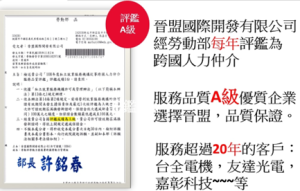 2010年起每年獲得勞動部年度仲介服務品質評鑑A級,取得就業服務專業人員證照共八名,證明晉盟公司在仲介領域的專業與用心。